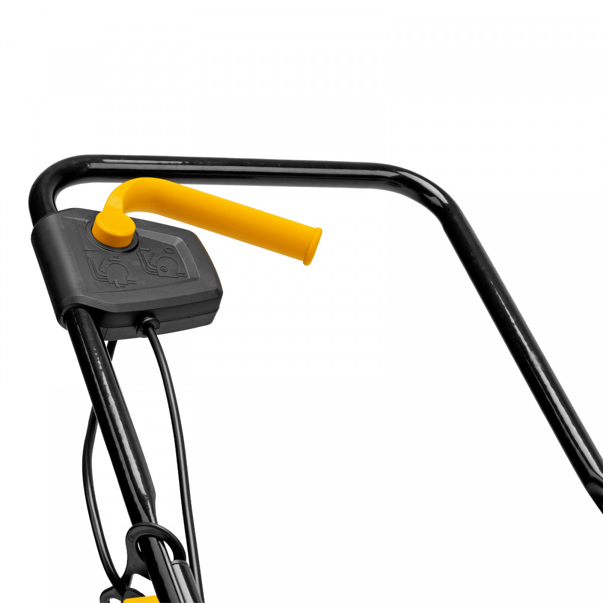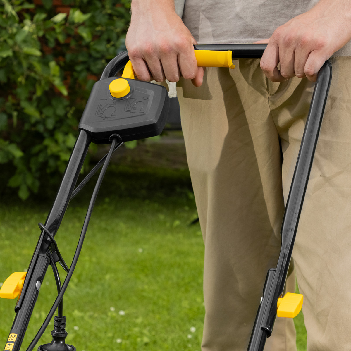 - Безопасность — функция блокировки исключает случайный запуск двигателя, а держатель кабеля предотвращает отключение техники от сети и уменьшает риск попадания провода под нож.