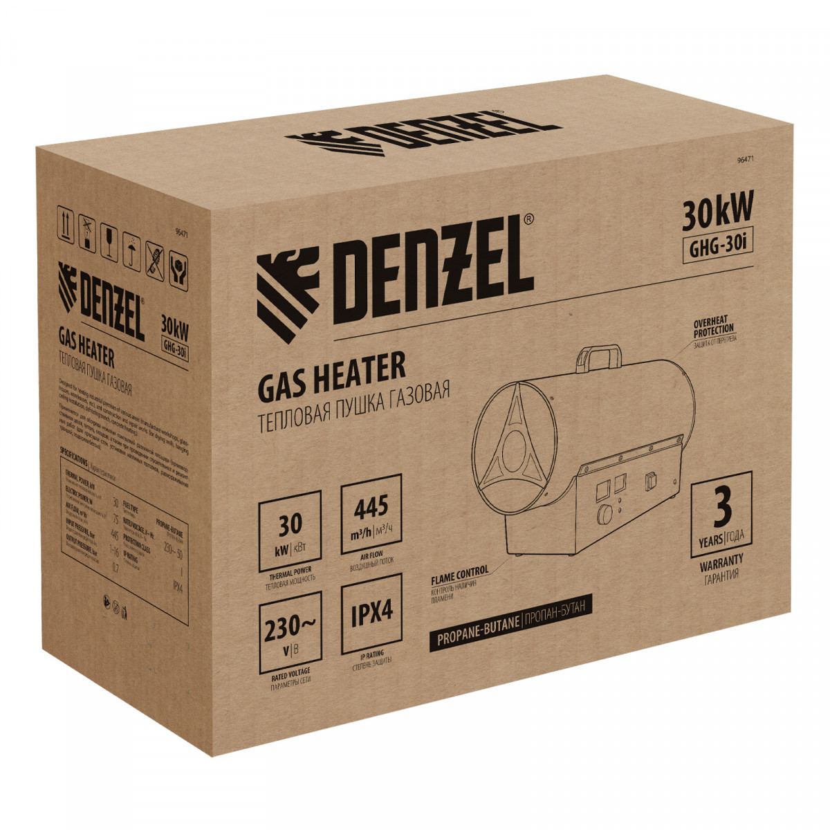 Газовая тепловая пушка Denzel GHG-30i 96471 мощностью 30 кВт, с цифровым термостатом и двойным электромагнитным клапаном, работает на сжиженном газе пропан-бутан и предназначена для обогрева хорошо вентилируемых нежилых помещений площадью до 300 кв. м: складов, цехов, гаражей, мастерских, теплиц. Генерирует воздушный поток 445 куб. м/ч, поэтому эффективно справляется с поставленными задачами. Используется на строительных и производственных объектах, для монтажа натяжных потолков.