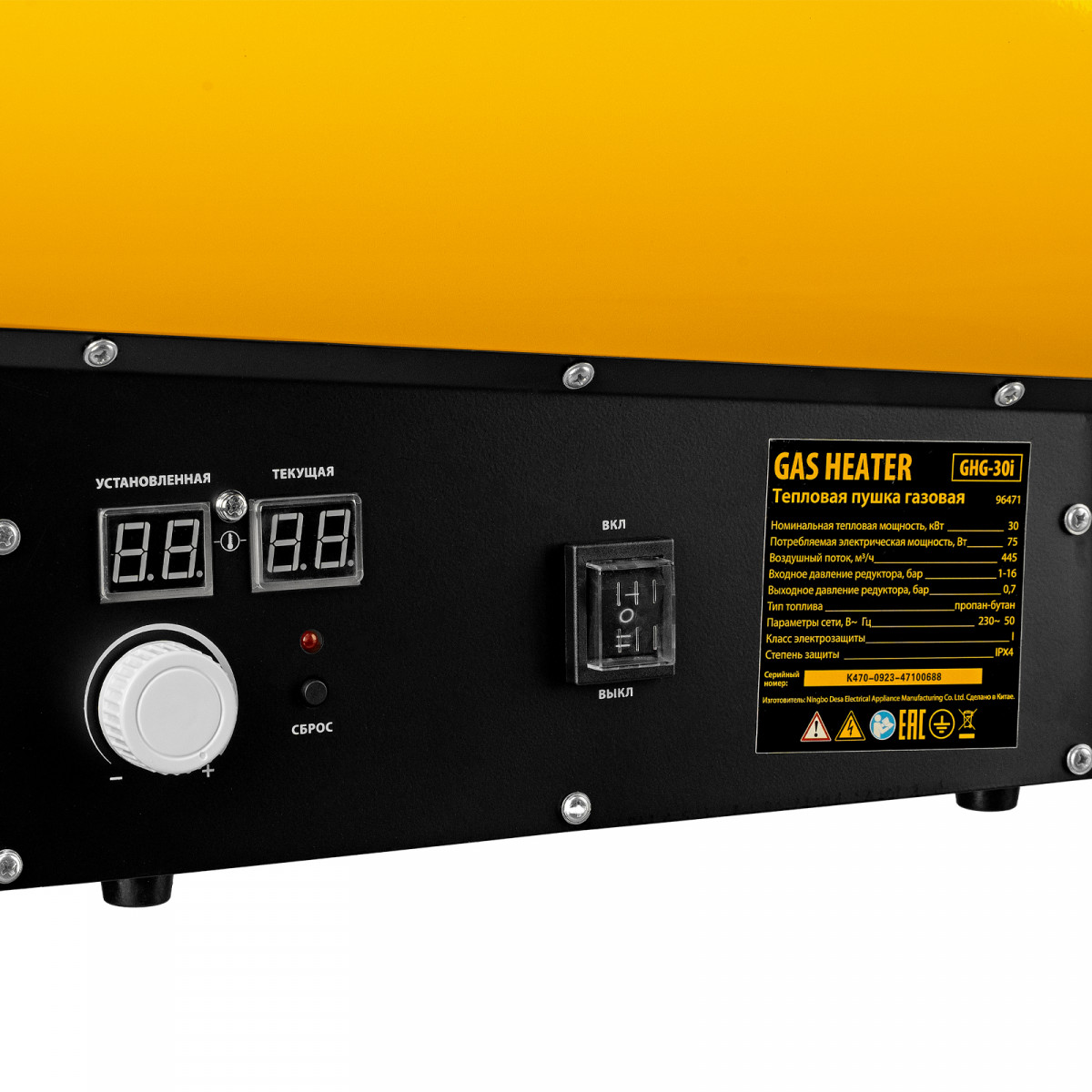 • Цифровой термостат — если температура в помещении становится ниже заданной, пушка включается автоматически для точного поддержания выставленных значений.