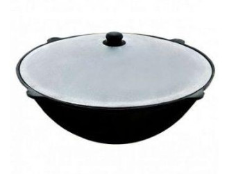 Чугунный казан 8 л, круглое дно, с алюминиевой крышкой идеально отшлифован и имеет гладкую внутреннюю поверхность.