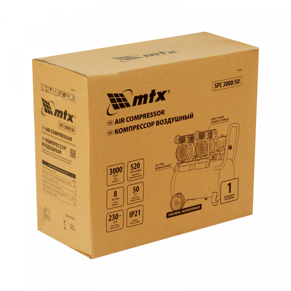 Безмасляный малошумный компрессор MTX SPC 3000/50 58140 мощностью 3000 Вт и производительностью 520 л/мин, с ресивером объемом 50 л, позволяет обеспечить пневматический инструмент сжатым воздухом под давлением до 8 бар. Воздушный поток не содержит частиц масла, поэтому компрессор можно использовать для проведения покрасочных работ и продувки электронных компонентов. Отличительной особенностью компрессора является низкий уровень шума, не превышающий 75 дБ, поэтому его использование не доставляет дискомфорт.