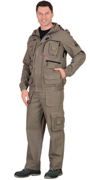 Костюм "Канвас" летний: куртка, брюки.Куртка прямого силуэта, с центральной застежкой на молнию с ветрозащитным клапаном, притачным капюшоном, притачным поясом частично стянутым на резинке. Куртка имеет множество объемных накладных карманов, карманы на молнии, притачные манжеты на резинке, налокотники, погоны и вентиляционные вставки.Брюки прямого силуэта с застежкой гульфика на "молнию", с широким поясом, частично стянутым на резинку и накладными объемными карманами.