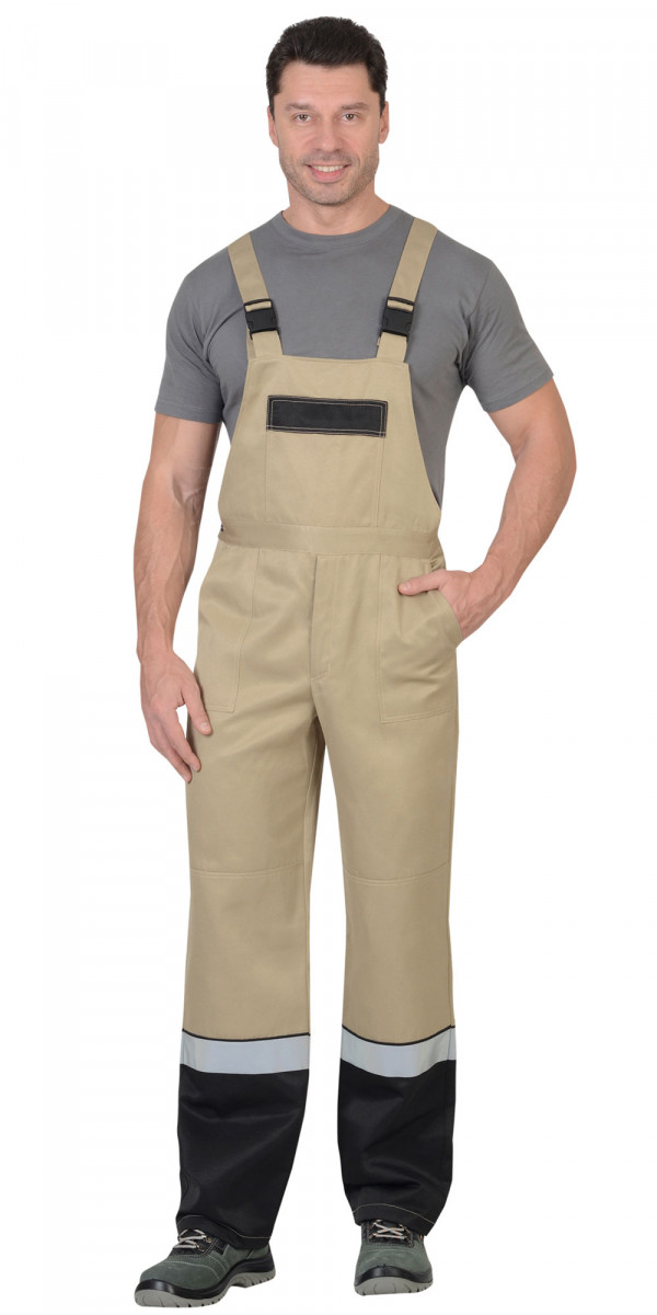 Куртка укороченная ; с центральной застежкой на пуговицы, с налокотниками , с поясом на резинке с накладными карманами и светоотражающей лентой 50 мм.Полукомбинезон с застежкой гульфика на тесьму "молния", с боковой застежкой на пуговицы, с накладными карманами, с наколенниками и светоотражающей лентой 50 мм.