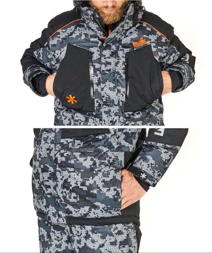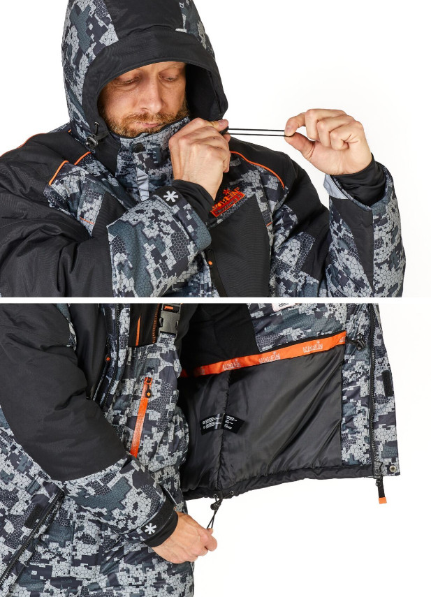 Костюм зимный, рыболовный, куртка и полукомбинезон из мембраны NORTEX BREATHABLE, водонепроницаемость 8000 мм, дышащая способность материала 6000г на кв.м за 24 ч, утеплитель HOLLOFIL. Рекомендованная температура до -35 град.С