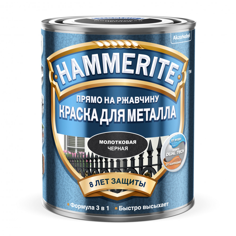 Молотковая эмаль с добавлением силикона. Прекрасно подходит для металлов, используется для дерева и различных видов пластика. С ее помощью создают износостойкое и долговечное антикоррозийное покрытие. Эмаль становится эффективной защитой от ржавчины. Молотковая эмаль Hammerite подходит как для цветных, так и черных металлов. Срок антикоррозийного эффекта составляет как минимум 8 лет.Отслаивающуюся краску и рыхлую ржавчину снимают. Обезжиривают растворителем. Чтобы получить чистую металлическую поверхность, применяют наждачную бумагу или металлическую щетку. Окрашенное металлическое покрытие промывают раствором обычного стирального порошка, потом – водой, затем высушивают.Молотковую эмаль необходимо тщательно перемешать перед нанесением. Покрывают поверхность валиком или кистью в 2 слоя, в 3 слоя – распылителем при температуре не менее +8°С и не более +25°С. Следующий слой наносится через 5 часов.Алкидные смолы, которые модифицированы полистиролом, растворитель, пигменты.