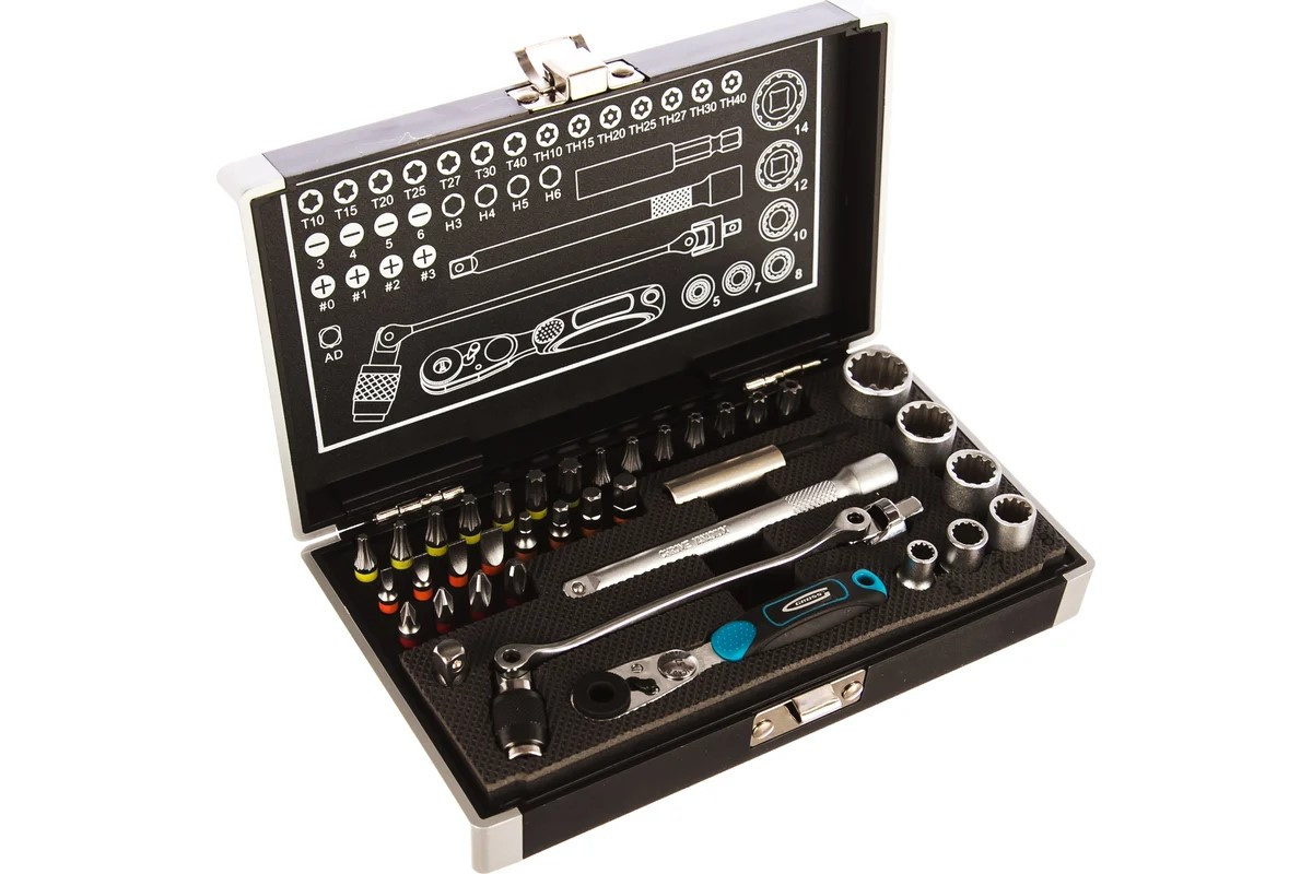 Набор Gross подходит для широкого спектра слесарно-монтажных работ, т.к. включает в ctmz 37 предметов: трещотку, адаптер, карданный ключ, торцевые головки и биты с хвостовиком 1/4".