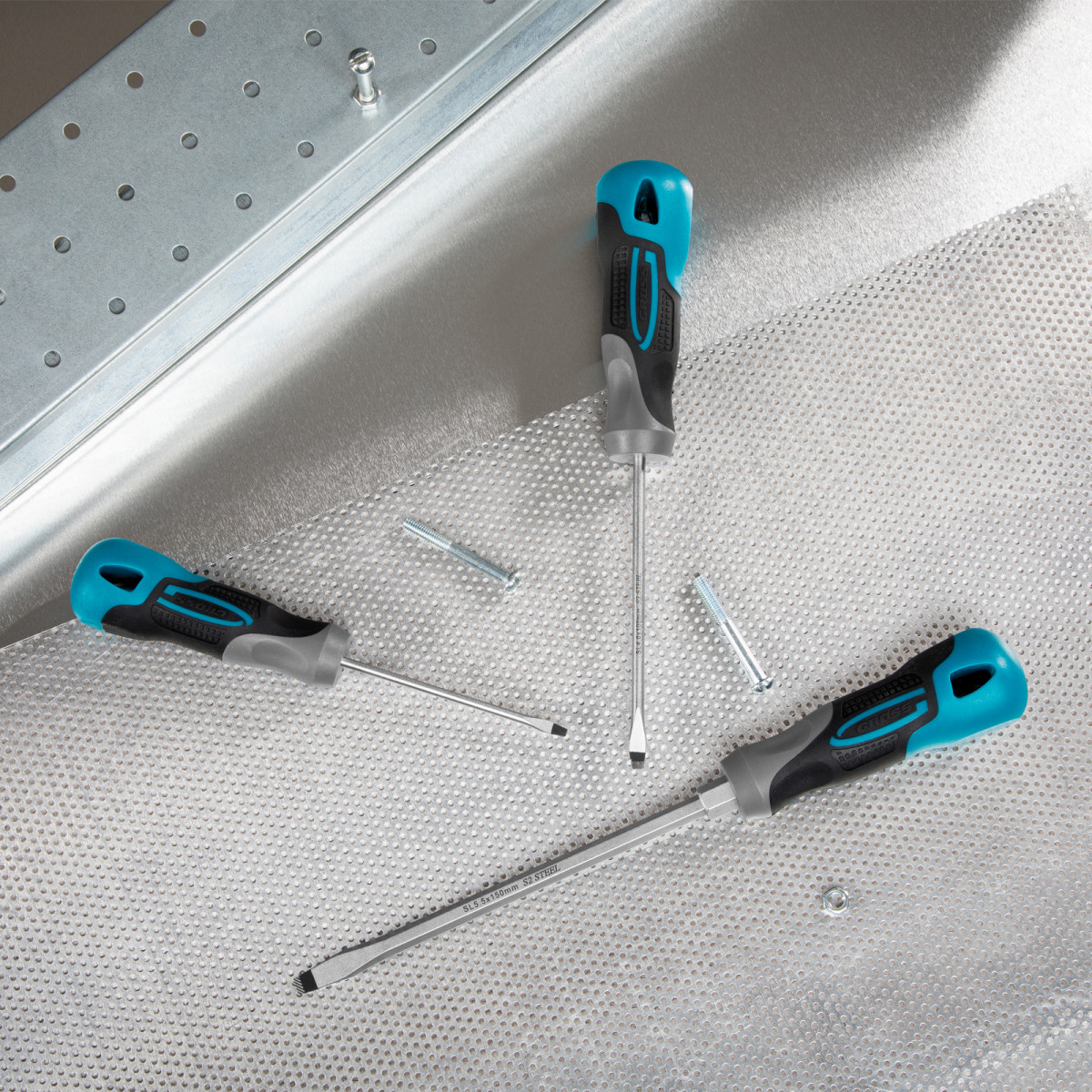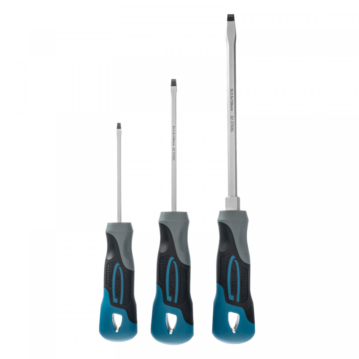 Набор из 3 отверток Gross 12165 из стали S2, с трехкомпонентными рукоятками, используется для монтажа и демонтажа крепежных элементов с профилем SL3, SL4 и SL5,5. Высокое качество отверток позволяет применять их для решения профессиональных задач с повышенными нагрузками. Отвертки в комплекте имеют стержни разной длины 75-150 мм для удобства работы с крепежом как на поверхности, так и в углублениях.