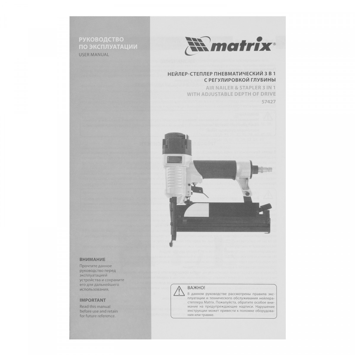 Пневматический нейлер-степлер 3 в 1 Matrix 57427 способен забивать на регулируемую глубину скобы 18 GA и гвозди 18GA и 16GA. Используется для фиксации паркетной доски, фанеры, ДВП, шифера, гипсокартона, ткани и бумаги. Пригодится во время ремонта, а также для сборки мебели и отделочных работ. Расход воздуха составляет 107 л/мин, поэтому нейлер-степлер можно подключать к любому типу компрессоров.