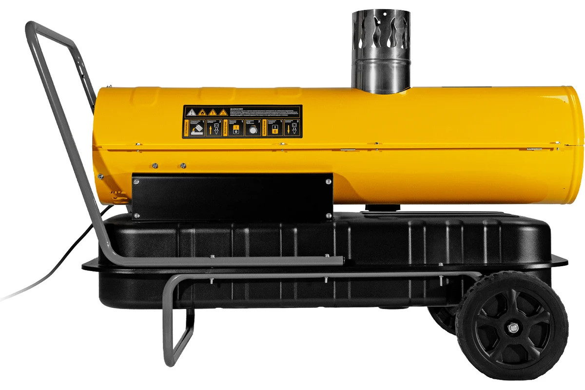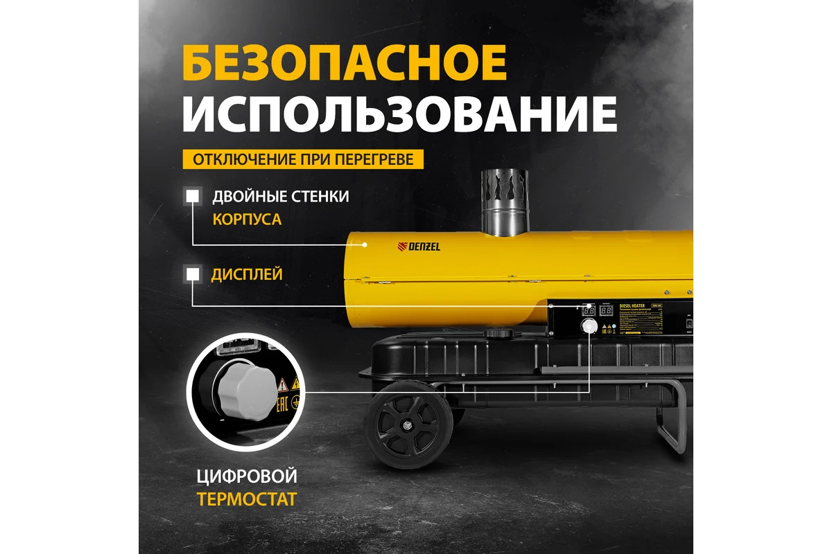 Дизельная тепловая пушка непрямого нагрева DENZEL NHG-30i 96492 с цифровым термостатом обладает тепловой мощностью 30 кВт и генерирует поток теплого воздуха 750 м3/ч.