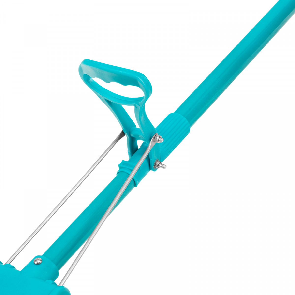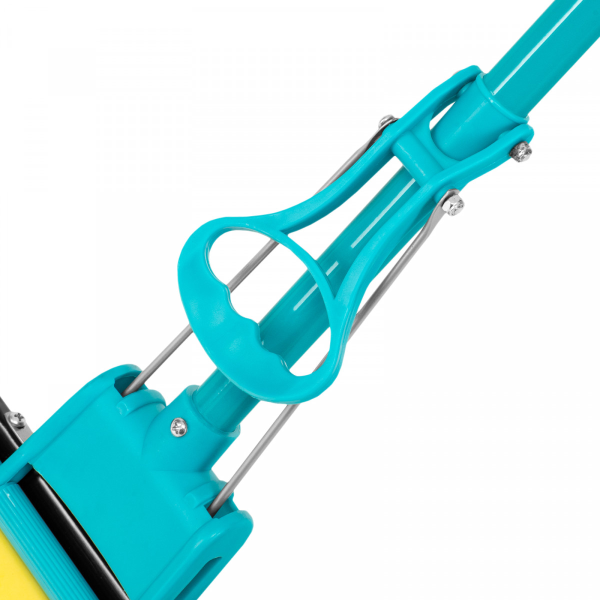 Бирюзовая отжимная швабра Palisad Home 93581 длиной 110 см, с телескопической рукояткой и полимерной губкой размером 26 x 5,5 x 6 см, используется для проведения влажной уборки. Губка из поливинилацетата хорошо впитывает влагу и эффективно удаляет загрязнения с напольных покрытий всех видов. Отжимной механизм позволяет исключить контакт рук с грязной водой, моющими средствами и обрабатываемой поверхностью.