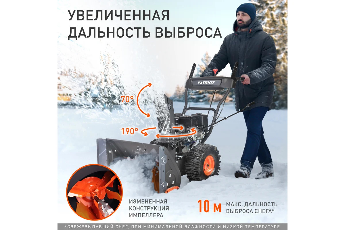 - Регулировка дальности выброса, угол выброса снега 70°;