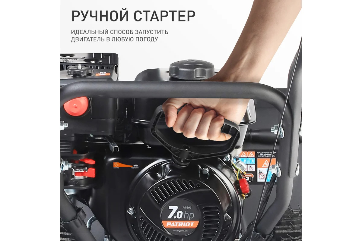 PATRIOT PS 603 – снегоуборщик с бензиновым двигателем, обладающим мощностью 6,5 лошадиных сил. Модель отличается высокой маневренностью и проходимостью, простотой управления и долгим сроком эксплуатации, что достигается за счет использования в конструкции подшипников, а не втулок. Ресурс модели увеличен также за счет использования бронзовой шестерни редуктора шнека. PATRIOT PS 603 имеет механическую трансмиссию. Для движения вперед предусмотрены 5 скоростей, для движения назад – 2 скорости. Благодаря широким колесам, которые не скользят на обледенелом дорожном покрытии, обеспечивается устойчивость машины. При необходимости их можно накачать.