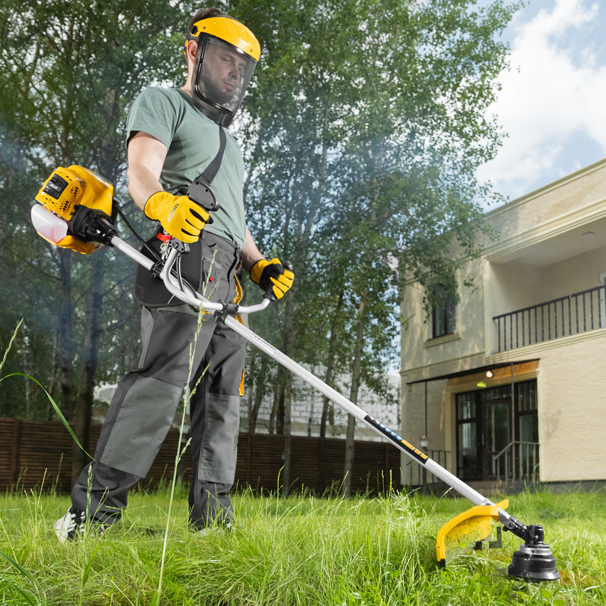 Бензиновый триммер Denzel DTL-33 96261 с объемом двигателя 33 см3 и неразъемной штангой подходит как для частичного подравнивания газона, так и скашивания травы всех типов, в том числе с жесткими древовидными стеблями (полыни, крапивы, лебеды, борщевика). Также эффективен для срезания кустарника и молодых побегов деревьев с диаметром стволов до 10 мм. Два режущих инструмента — леска и пильный диск — работают на скорости 9500 об/мин и обеспечивают ширину скашивания 42 и 25,5 см соответственно. Двигатель мощностью 1,8 л.с. экономично потребляет топливо, поэтому часто заправлять бак не придется. Триммер не требует подключения к стационарному источнику питания и может использоваться в самом отдаленном уголке дачного участка.