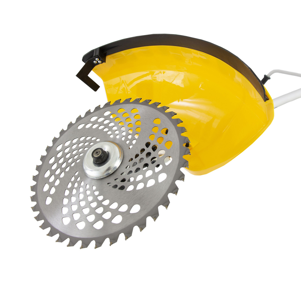 • Безопасная работа — защитный кожух закрывает режущую часть, поэтому в сторону пользователя не отлетают ветки и камни.