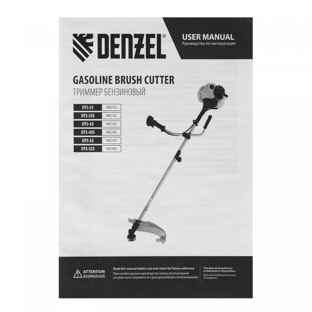 Триммер бензиновый DTS-33, 33 см3, неразъемная штанга, состоит из 2 частей Denzel