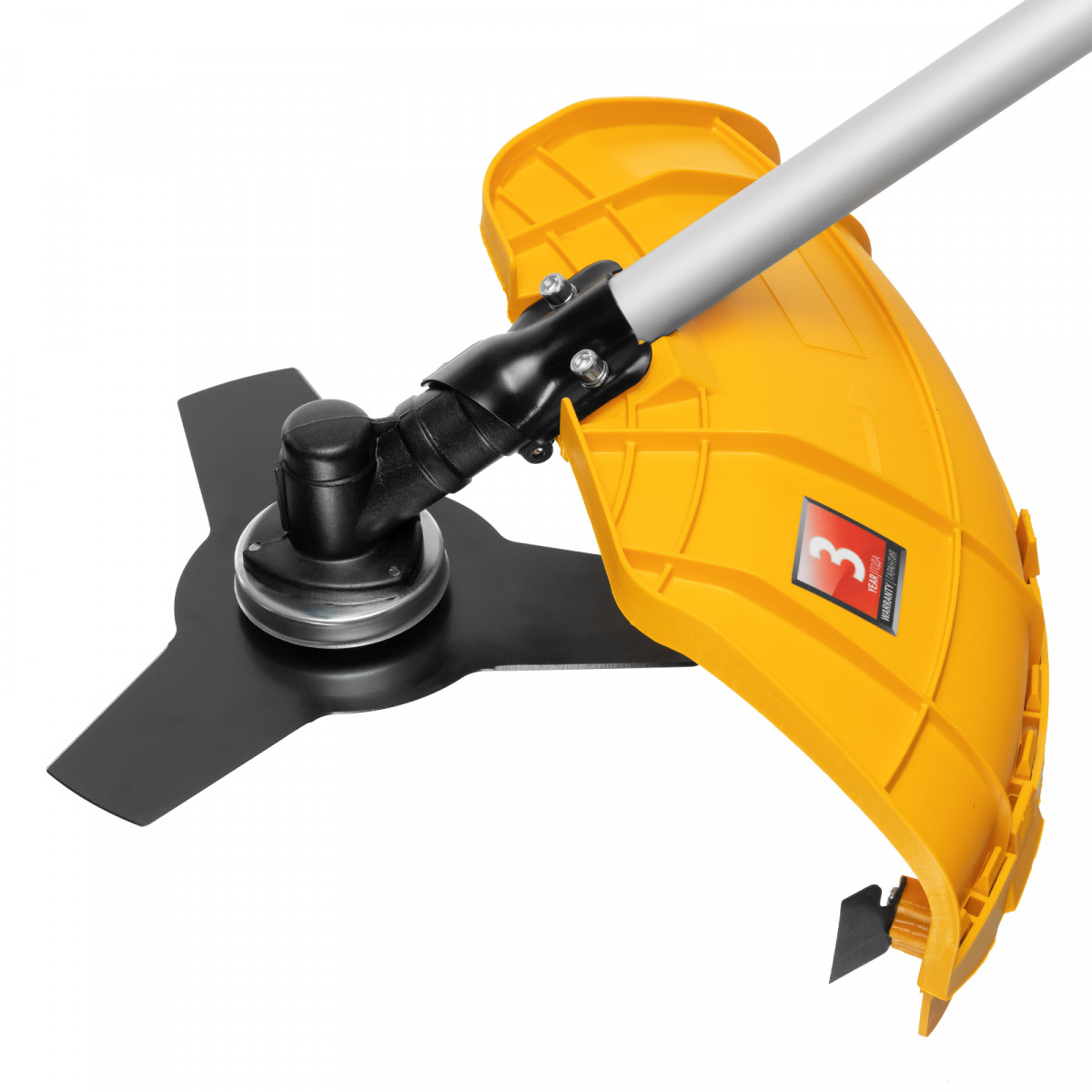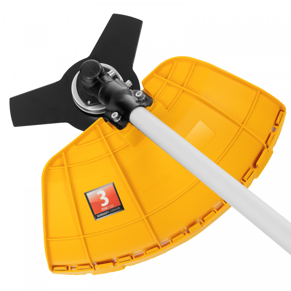 - Безопасная эксплуатация — прочный кожух, закрывающий оснастку, защищает пользователя от летящей травы, грязи и мелких камней.