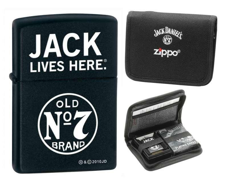 Набор состоит из классической бензиновой ветрозащищенной зажигалки Zippo и колоды картонных игровых карт. Зажигалка имеет матовую поверхность корпуса черного цвета. На лицевой стороне изображен логотип всемирно известной марки виски Jack Daniel's Old No.7. Зажигалка и карты упакованы в фирменную подарочную сумочку черного цвета.